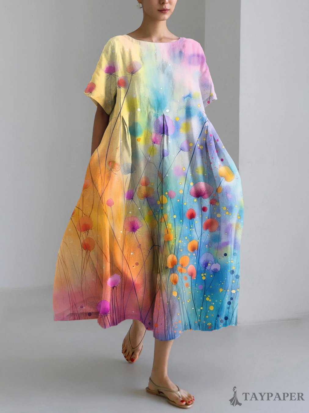Vintage Flower Art Print Linen Blend Maxi Dress