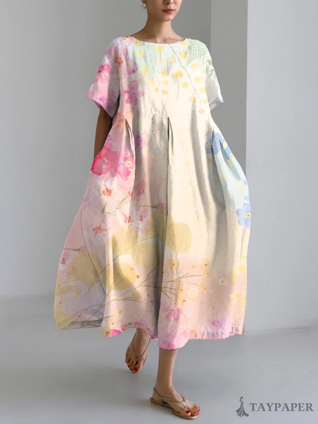 Vintage Flower Art Print Linen Blend Maxi Dress