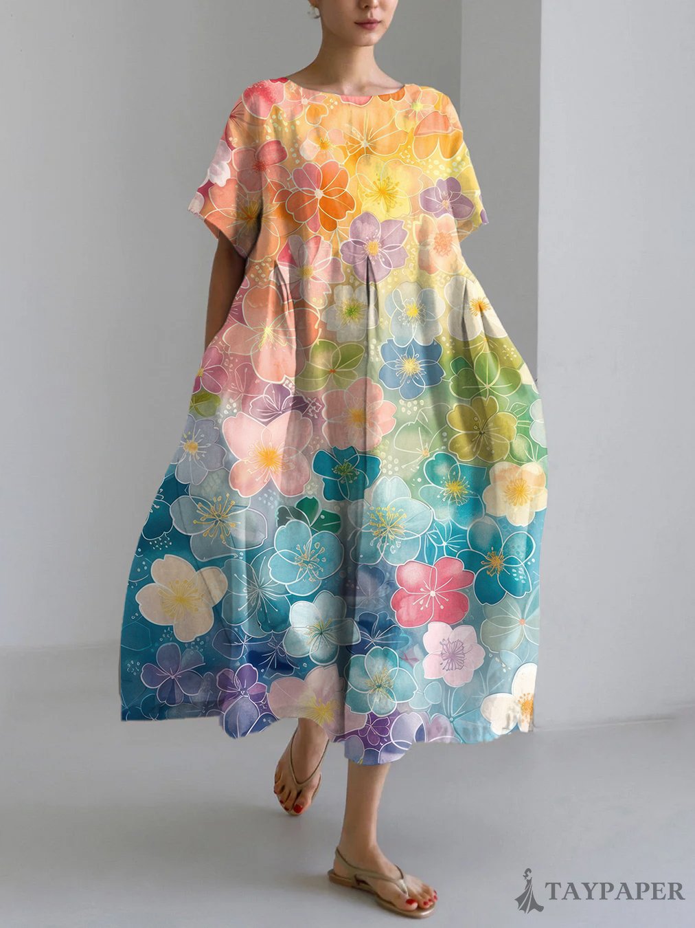 Vintage Flower Art Print Linen Blend Maxi Dress