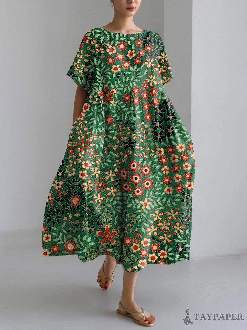 Vintage Flower Japanese Art Print Linen Blend Maxi Dress