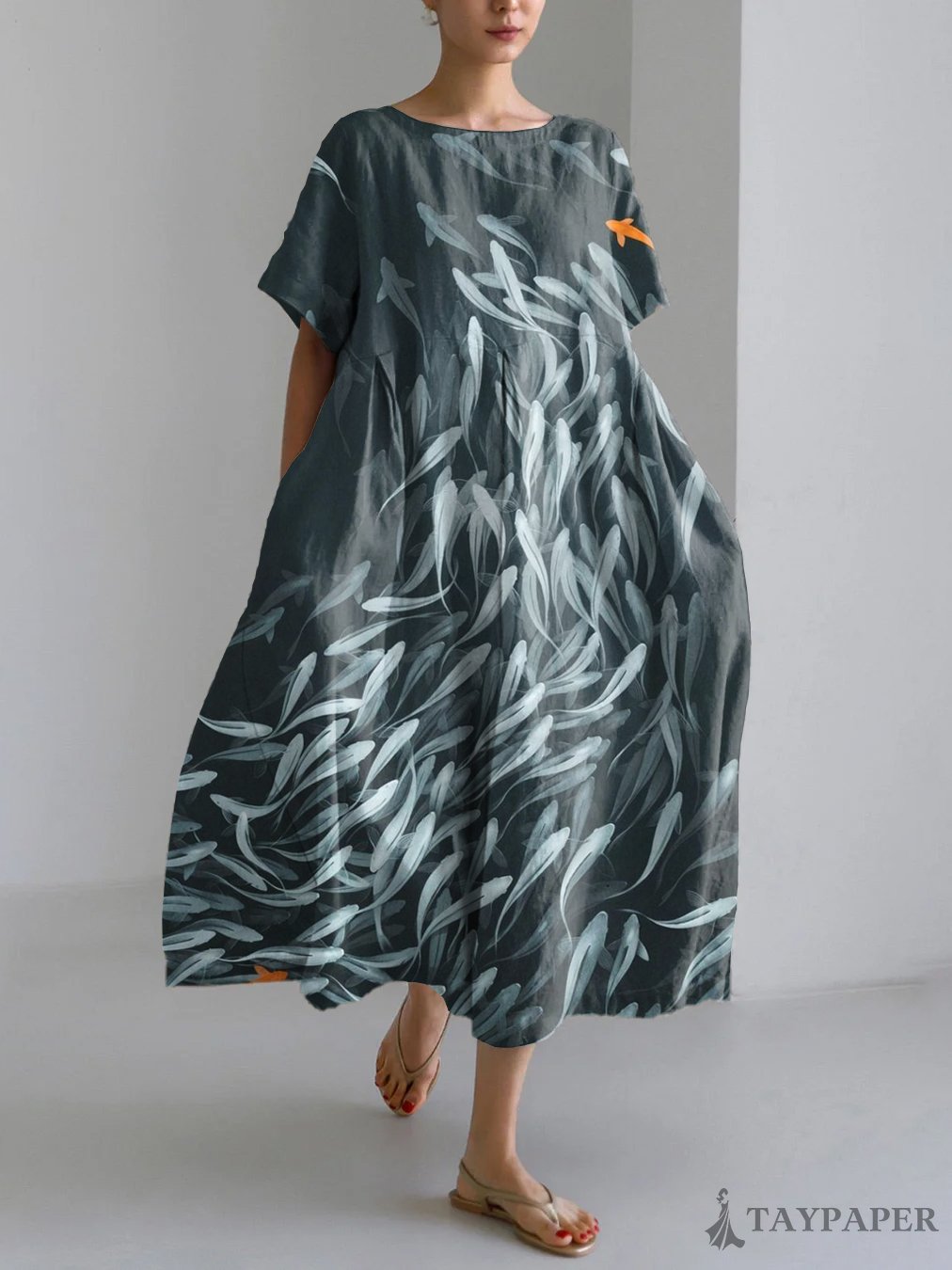 Vintage Japanese Art Fish Print Linen Blend Maxi Dress