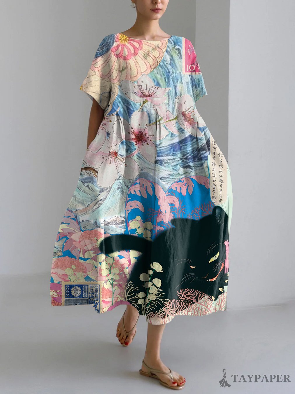Vintage Japanese Art Flower Cat Print Linen Blend Maxi Dress
