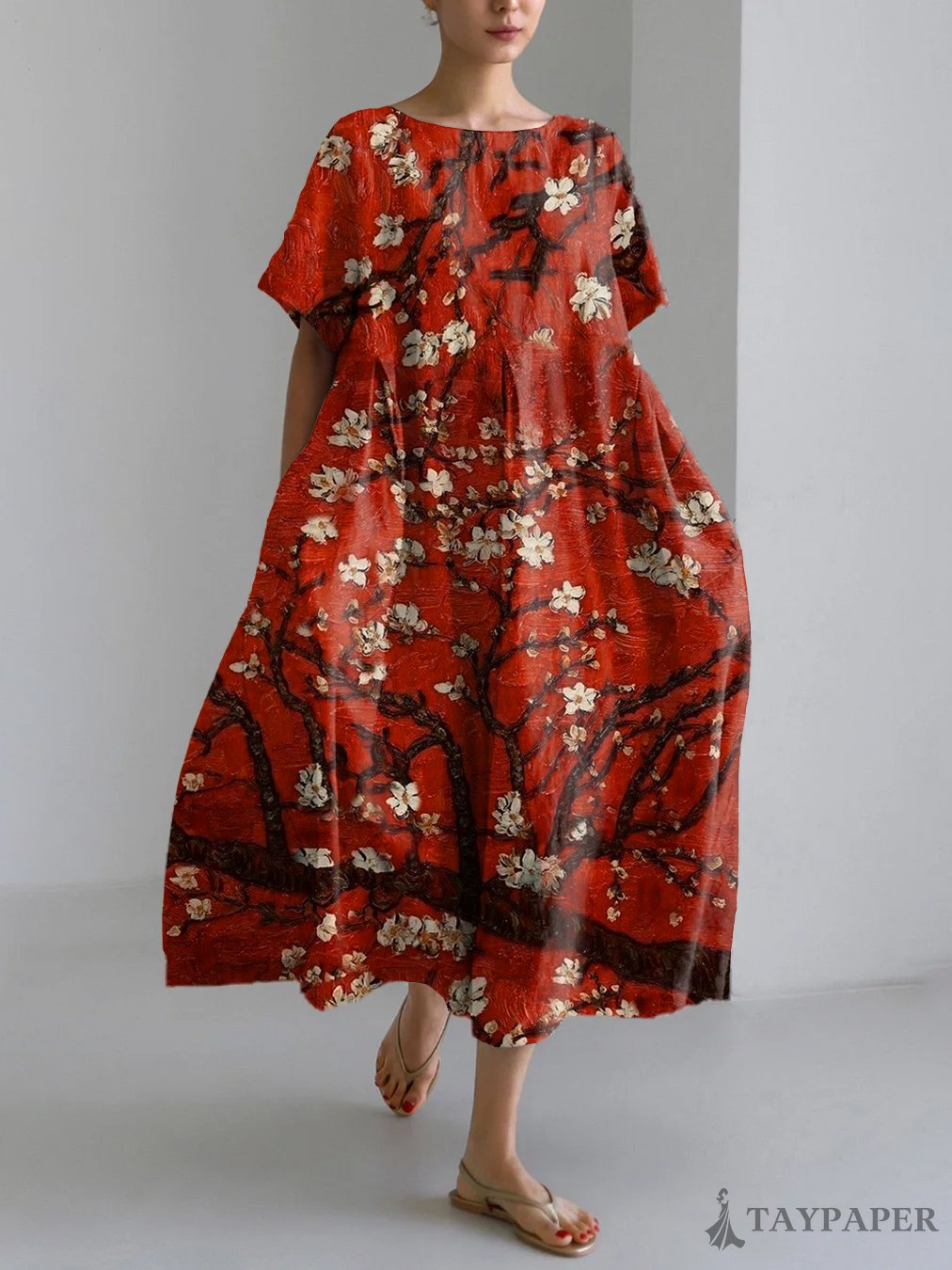 Vintage Japanese Art Flower Print Linen Blend Maxi Dress