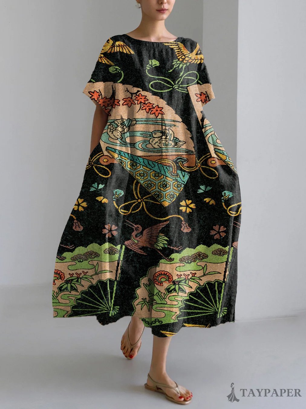 Vintage Japanese Art Print Linen Blend Maxi Dress