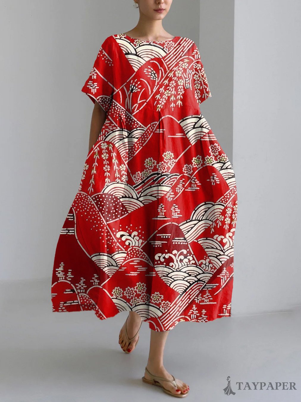 Vintage Japanese Art Print Linen Blend Maxi Dress