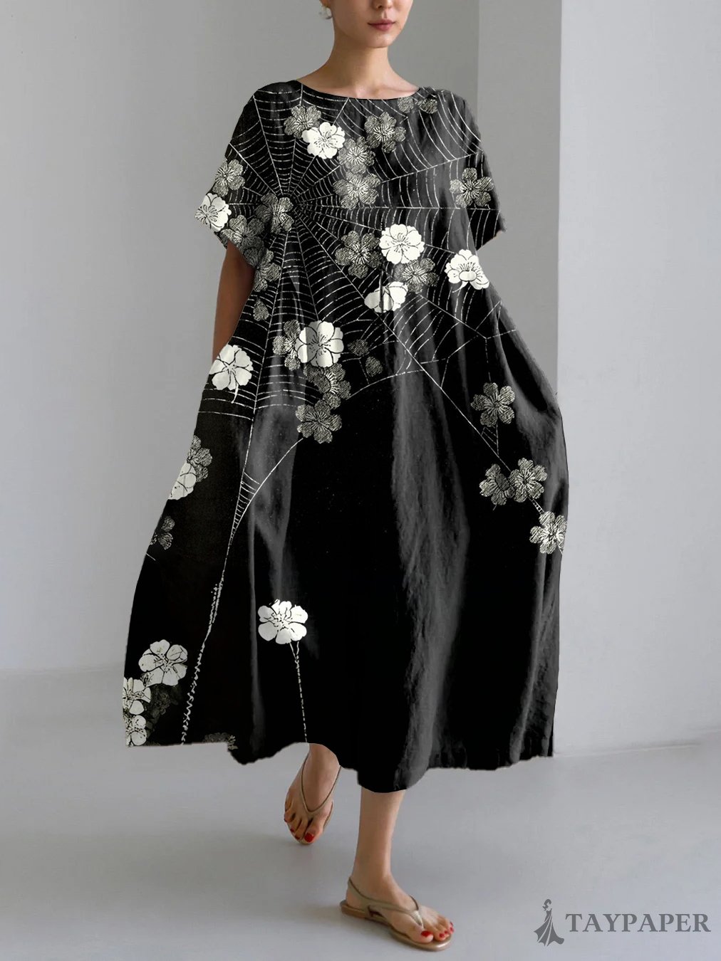 Vintage Japanese Art Spider Web Flower Print Linen Blend Maxi Dress