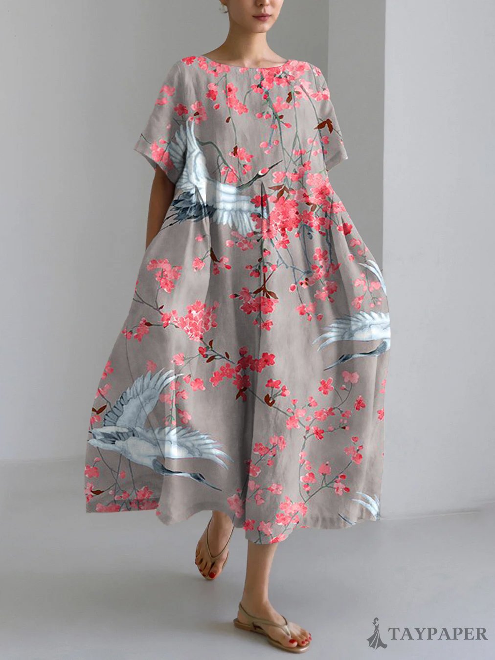 Vintage Japanese Crane Art Print Linen Blend Maxi Dress
