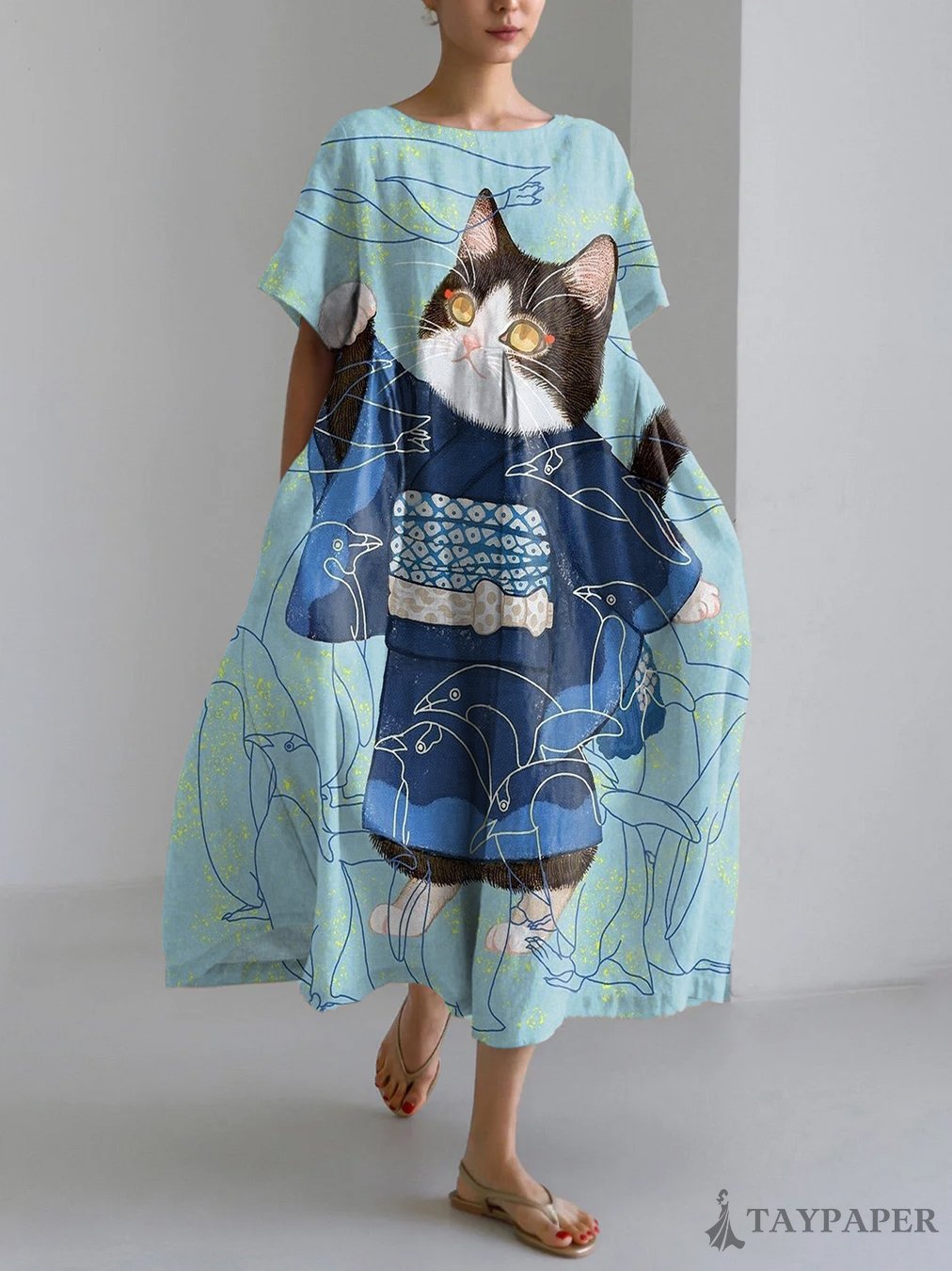 Vintage Kimono Cat Pattern Linen Blend Maxi Dress