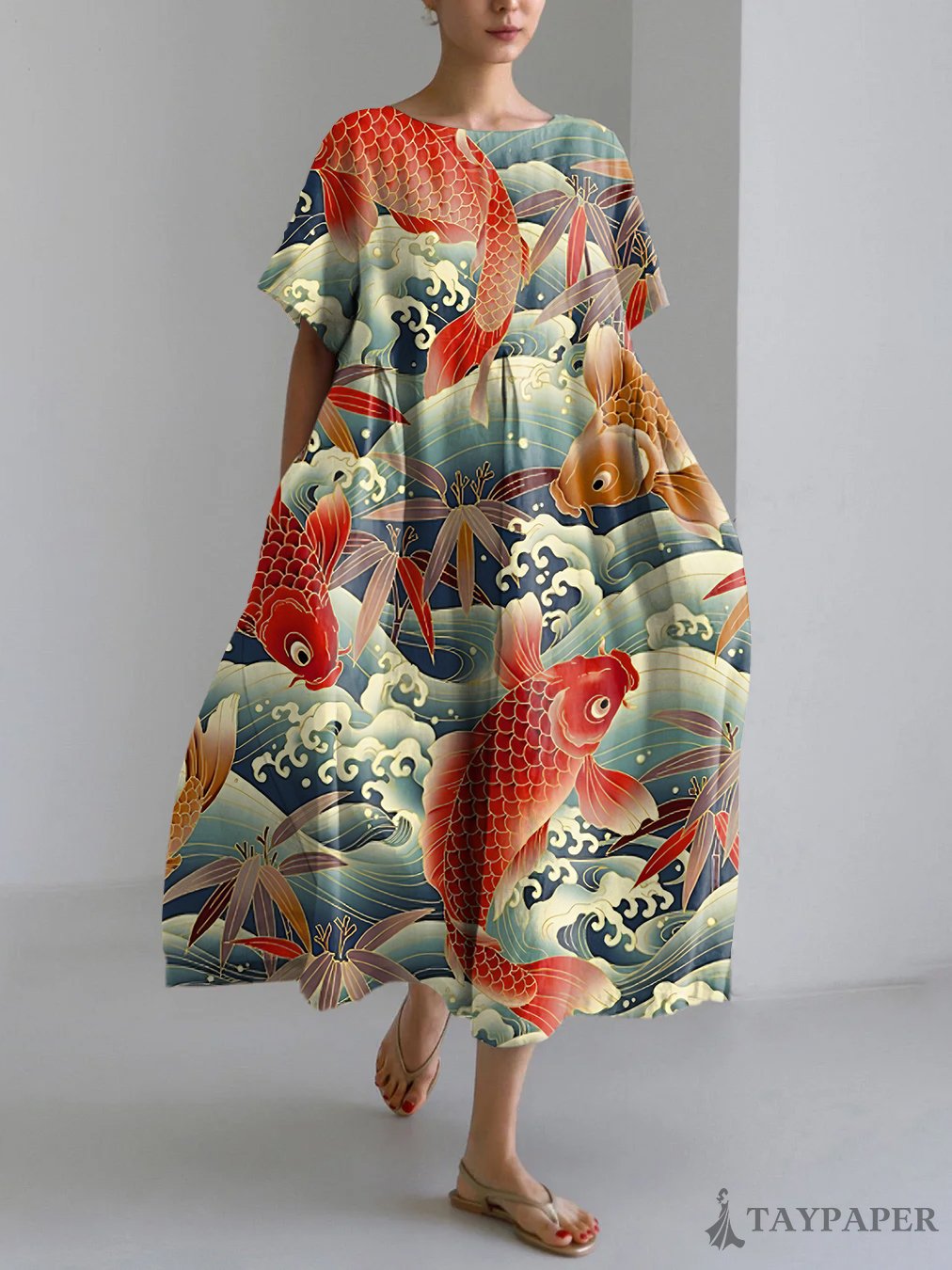 Vintage Koi Fish Pattern Linen Blend Maxi Dress