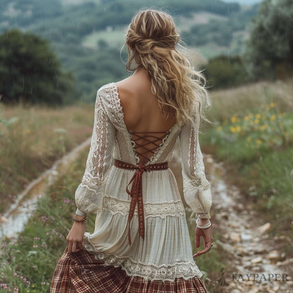 Women's Retro Pastoral Style Lace Long-sleeve Sexy Maxi Long Dress