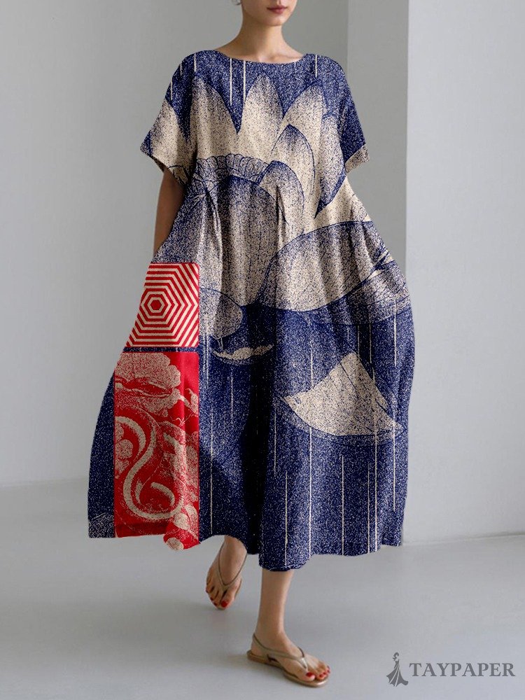 Vintage Lotus Flower Art Linen Blend Maxi Dress