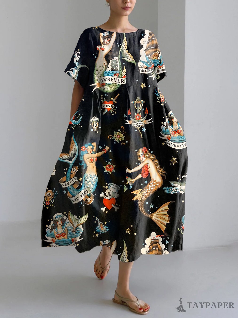 Vintage Mermaid Pattern Linen Blend Maxi Dress