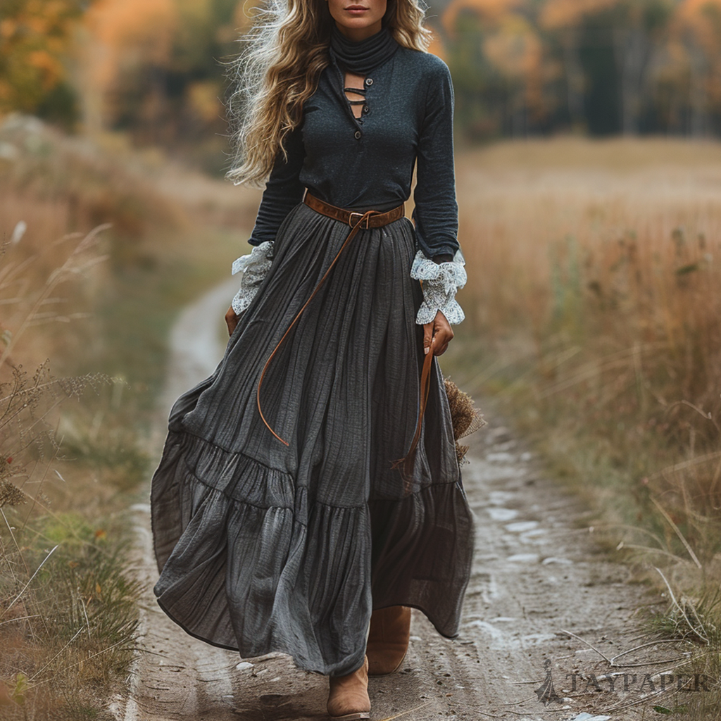 Women's Vintage Paneled Linen Long-sleeve Maxi Long Dress