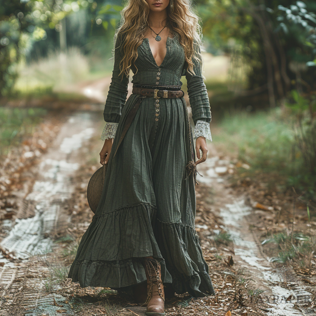 Women's Vintage V-neck Linen Long-sleeve Maxi Long Dress