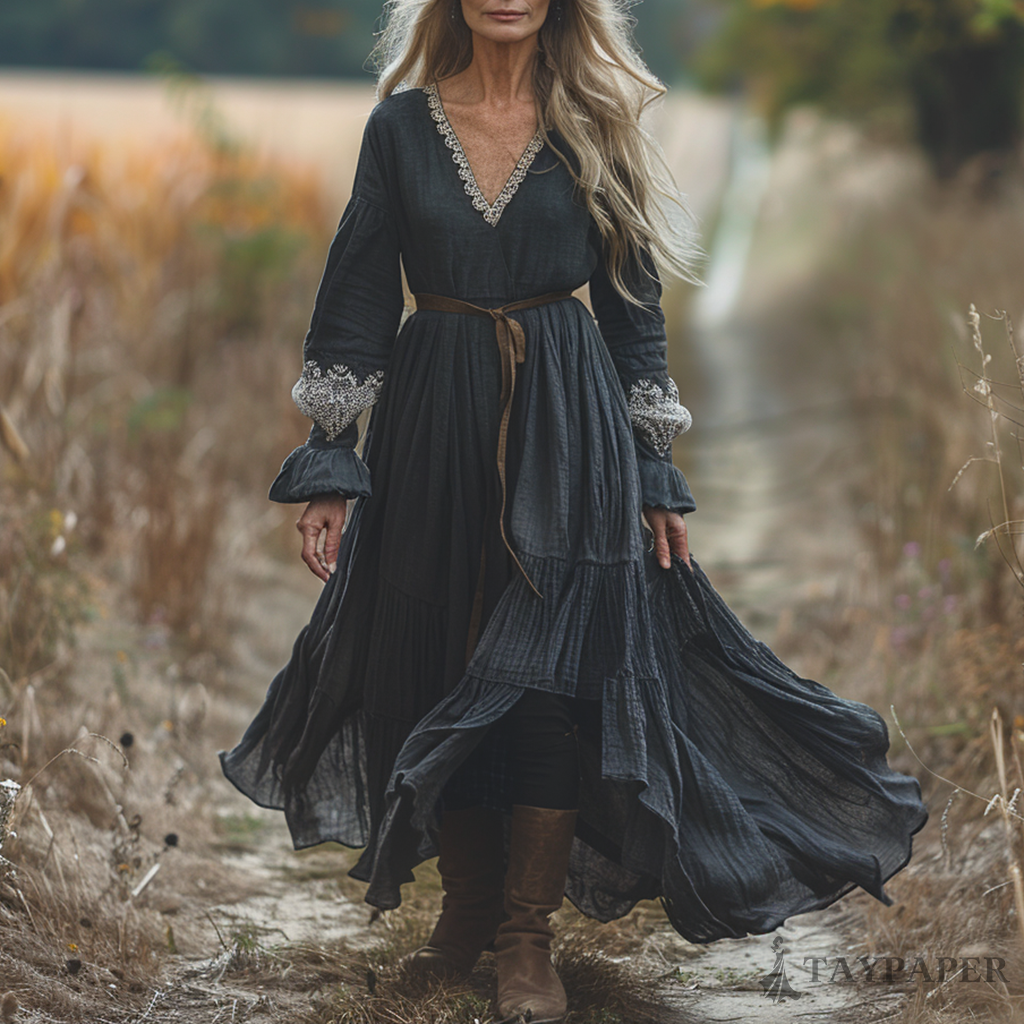 Women's Vintage Pastoral Style V-neck Linen Long-sleeve Maxi Long Dress