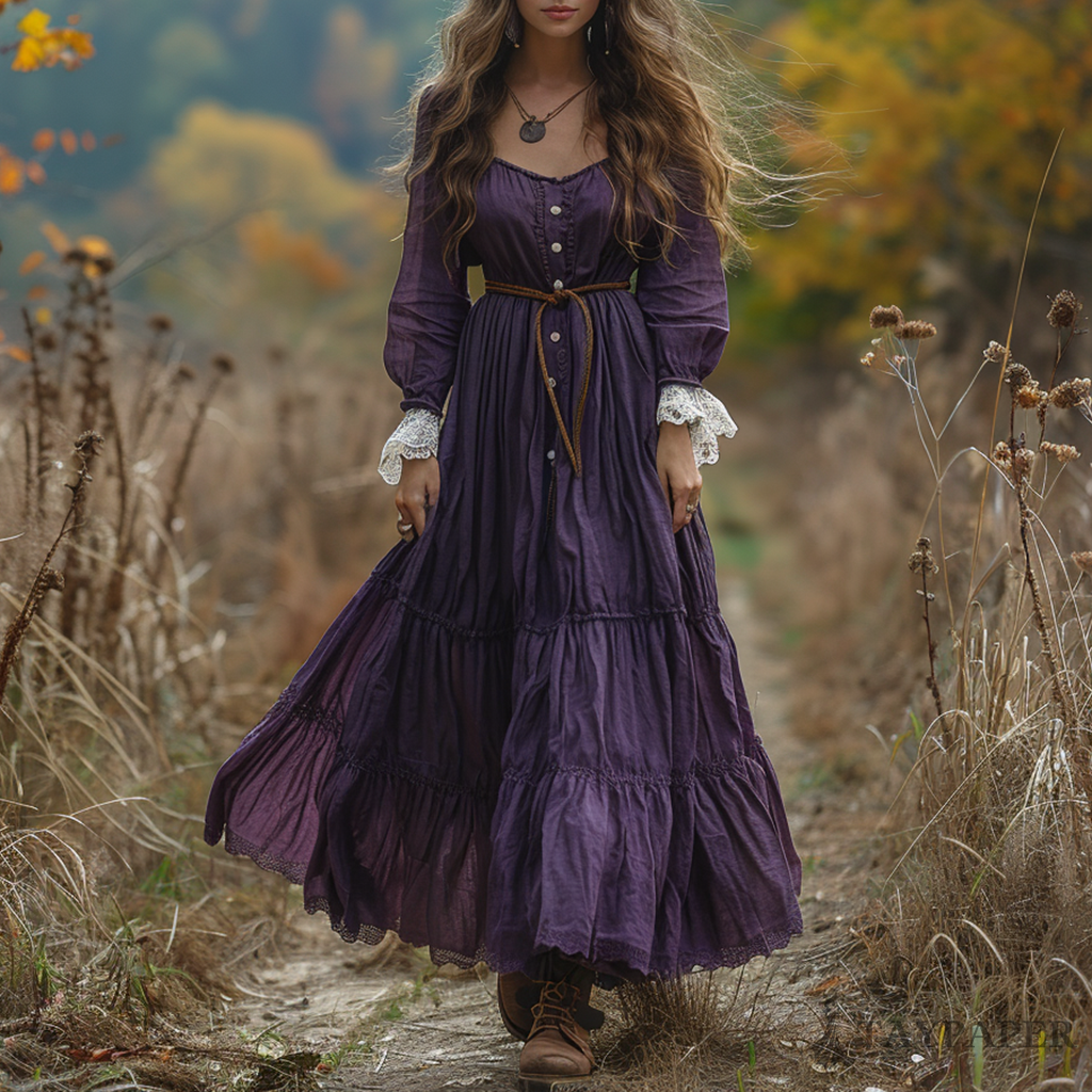Women's Vintage V-neck Linen Long-sleeve Maxi Long Dress