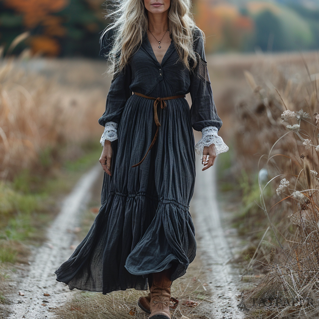Women's Vintage V-neck Linen Long-sleeve Maxi Long Dress