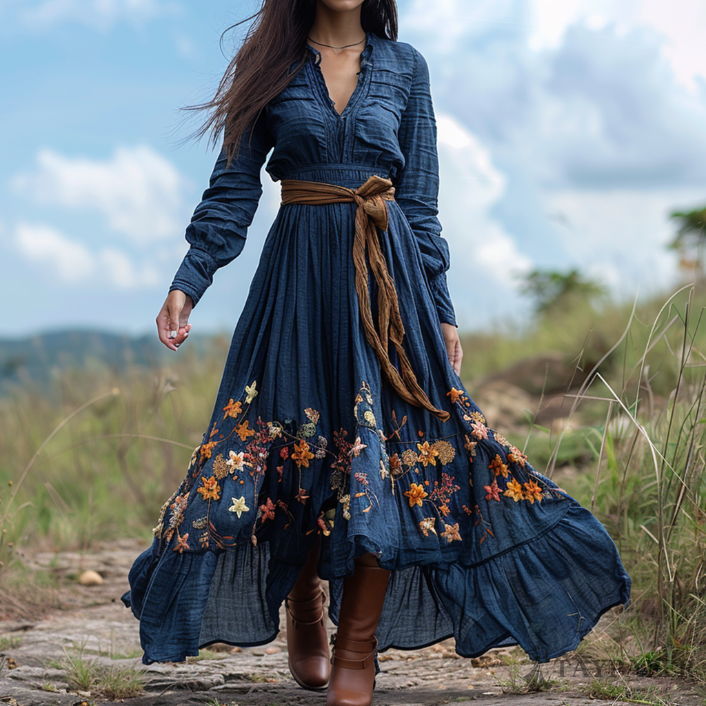 Women's Vintage V-neck Floral Bohemian Pastoral Style Long-sleeved Maxi Long Dress