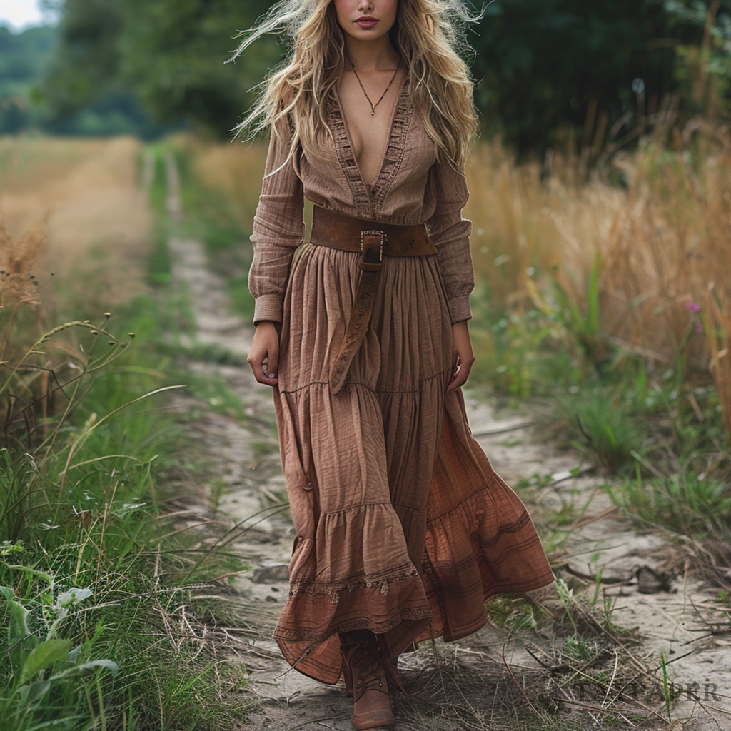 Women's Vintage V-neck Bohemian Pastoral Style Long-sleeved Maxi Long Dress