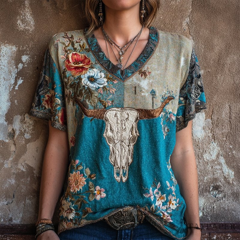 Western Bull Skull & Flowers Embroidered Comfy T Shirt