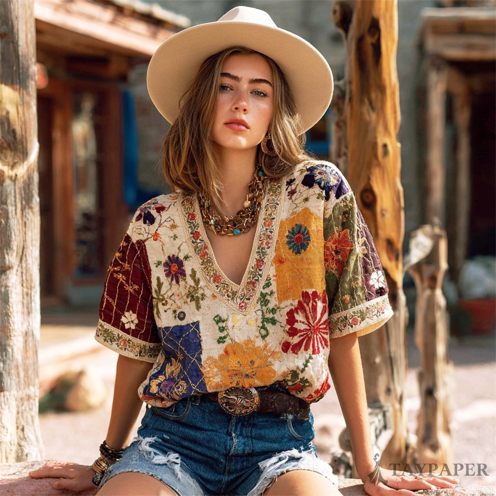 Western Vintage Boho Floral Embroidery Women's Linen V-neck T-shirt