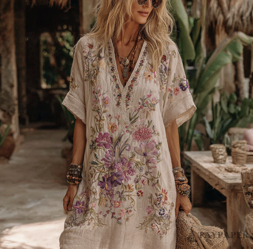 Women's Floral Embroidery Art V Neck Comfy Midi Dress