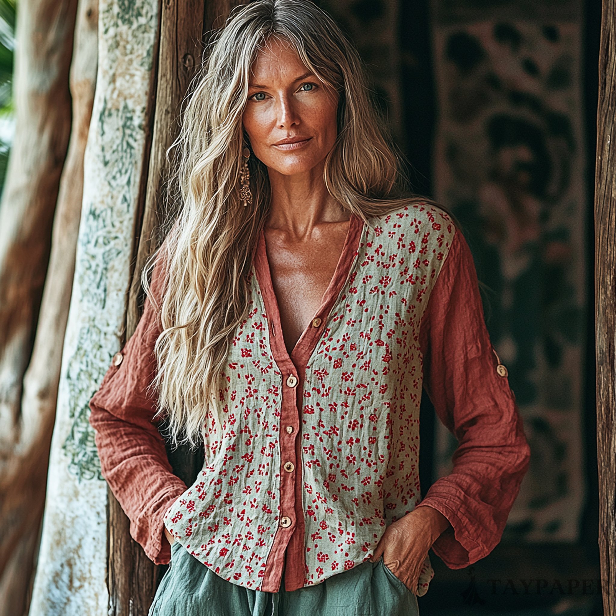 Women's Linen Vintage Mini Floral Print Casual Shirt