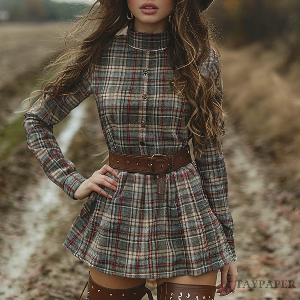 Women's Retro Plaid Pastoral Style Long-sleeve Short Dress