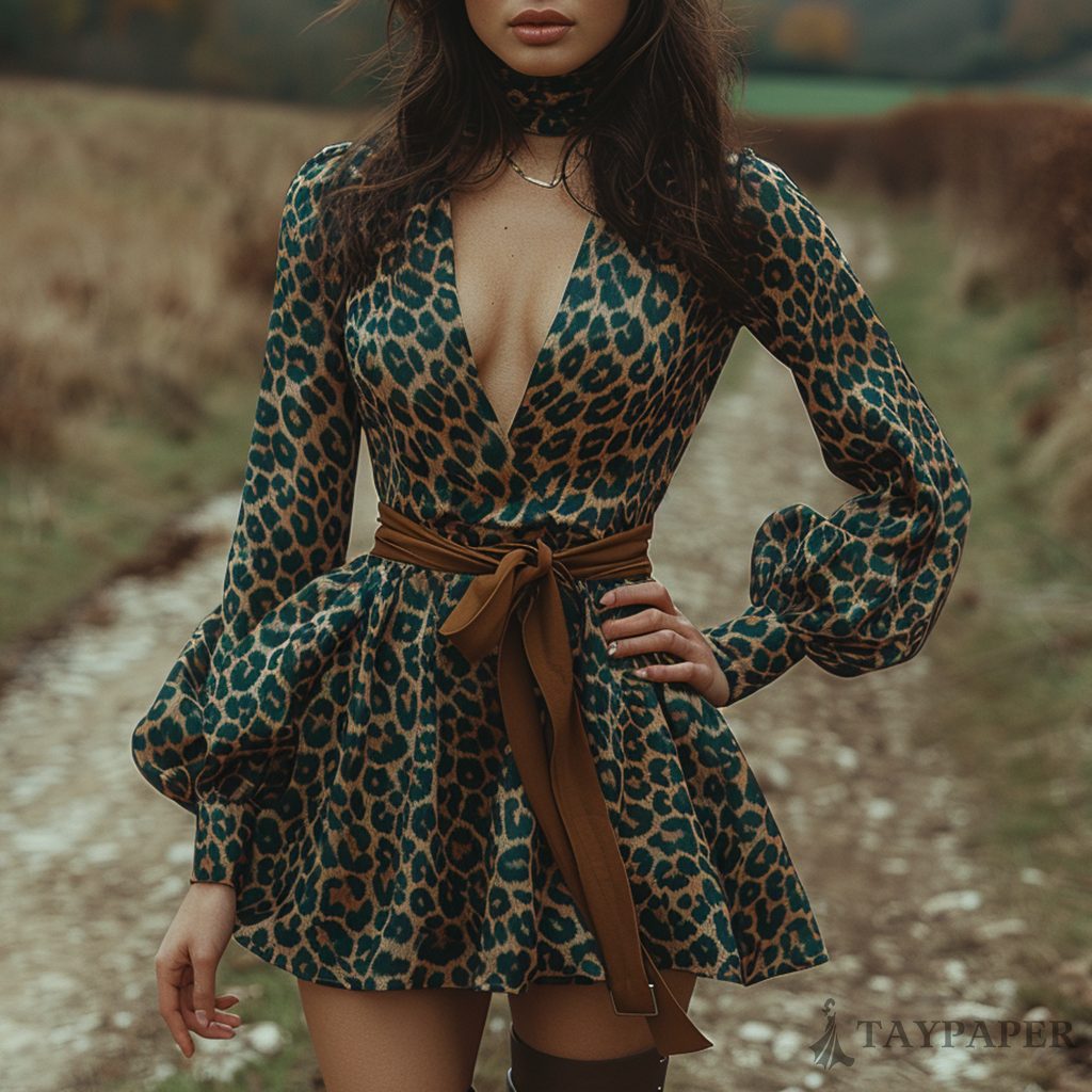 Women's Retro Pastoral Leopard Style Long-sleeve Short Skirt Dress